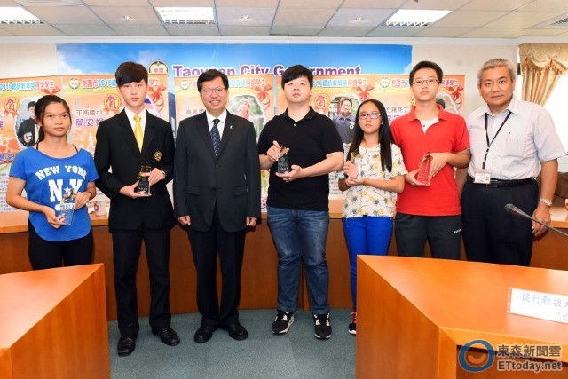 面對困境,認真前行,榮獲「2016總統教育獎」的范宜玲、簡安妤、曾湧棠、李宗翰、黃冠龍等五名同學,4日由桃園市議員王浩宇、教育局長高安邦陪同,拜會市長鄭文燦。鄭文燦除頒贈「勤敏樂學」琉璃獎座並肯定,該5位同學克服挑戰,努力、認真的態度,足以作為所有年輕人的表率。