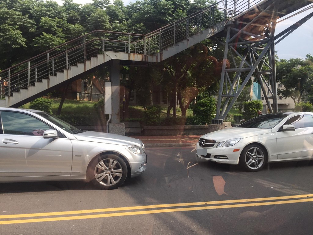 賓士大對決!桃園一名網友在臉書「爆料公社」PO文表示,4日下午行經蘆竹區仁愛與南山路口時,發現一輛賓士駕駛「逆向停車等紅燈」,恰巧碰到對向另一位賓士駕駛要過,一開始還不願讓路,直到對向駕駛搖下車窗大罵後才願意退讓。