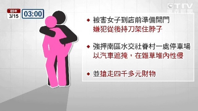 89年3月15日凌晨3點,被害人(當時21歲)到工作的餐廳準備開門時,被嫌犯從後持刀架住脖子,強押她到水交社眷村附近停車場性侵得逞,但警方一直未破案。第六分局偵查隊長林雲豪說,「她也覺得非常欣慰,心裡面還是會有一些陰影在啦!」