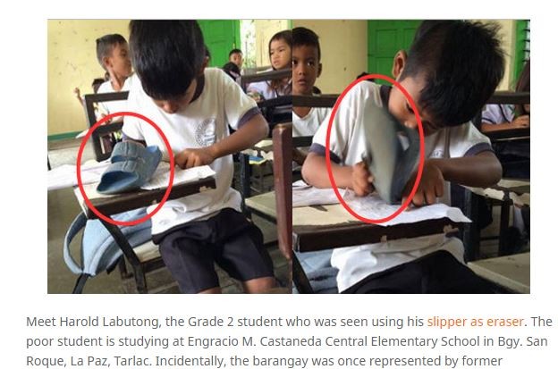 菲律賓一位小2的男同學,上課將橡膠拖鞋擺在桌上,行徑看起來古怪,但其實是因為家裡貧窮,買不起橡皮擦,因此他便將橡膠拖鞋當作擦步來修改文字,讓人看了相當心疼。不過這位男童家裡雖然貧困,但卻沒有因此放棄讀書,還比別人認真,有時用到筆都很難握了也不願意換,讓人感動。
