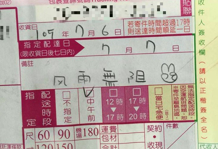 強颱尼伯特即將撲台,暴風圈最快今天下午會接觸東部陸地。一名網友就在「爆料公社」怒轉貼這張寄貨單,對於上面「備註」填寫的內容非常傻眼。網友們看完紛紛回應,「應該是小朋友的行為」、「不管是不是認真的,看到就覺得不爽,很好笑嗎?」。