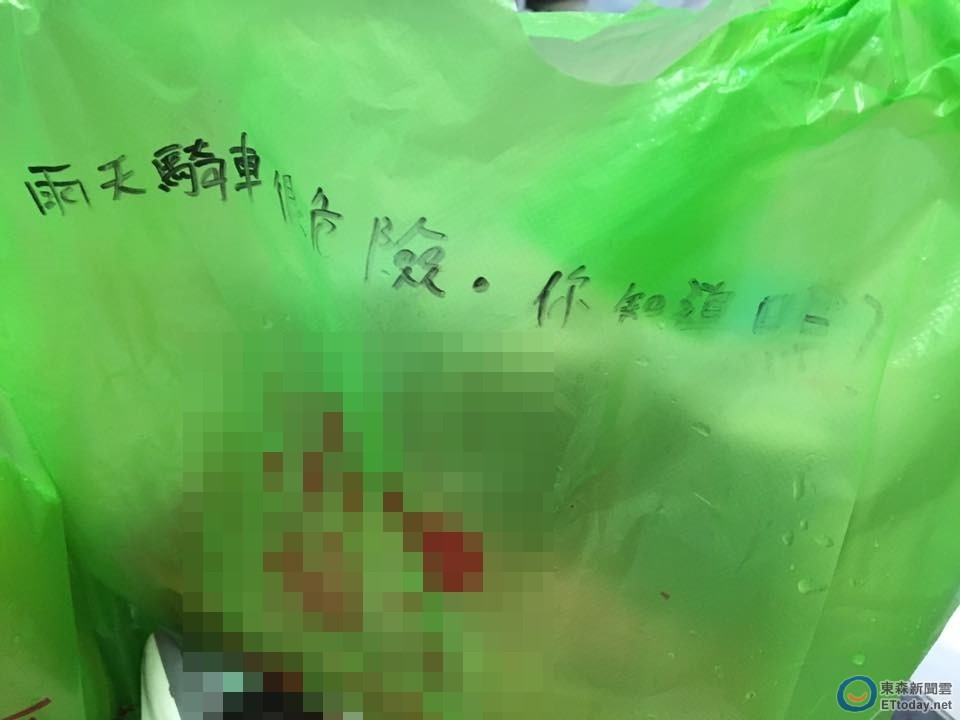 雨天到底該不該外送?尼伯特颱風剛走,但後勁仍在發威,台北9日晚間降下傾盆大雨。新北市一名女網友在臉書PO文表示,因與家人外出買的東西太多,實在沒有多餘的手可以提飲料,因此便去電叫外送,沒想到飲料送到後,袋子上竟然被店員寫下「雨天騎車很危險,你知道嗎?」
