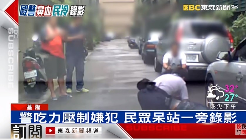 基隆七堵警方日前接獲報案,有一名男子在街上到處亂按門鈴,員警林秉毅到場才發現,是轄內的治安人口,當時疑似吸毒神智不清,上前制止後對方竟突然抓狂攻擊,他當場被打到流鼻血,還得努力壓制,不過誇張的是,當時好幾位民眾都在一旁錄影,卻完全沒有人主動上前幫忙。