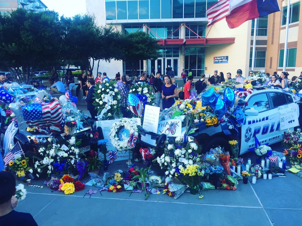 達拉斯殺警案造成5名員警殉職,據《CNN》報導,由達拉斯警察局、達拉斯地區捷運局所提供,用作為紀念的2輛警車,幾乎被卡片、蠟燭與鮮花給淹沒。據了解,當地企業發放食物、餐點給徹夜執勤的警察們,居民甚至聚集在警察總部外唱歌、祈求和平。