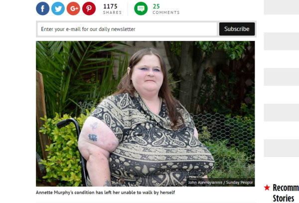 墨菲在15歲時就病診斷出罹患這樣的疾病,所以從那時候就開始服用類固醇的藥物,結果也影響她的發育,意外地讓她的胸部長到60HH。現在的她因為胸部太大,讓她的骨骼無法承受胸部的重量,現在她得靠輪椅代步。