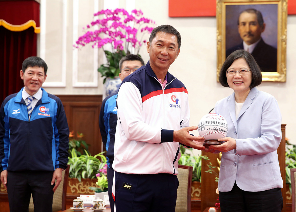 總統蔡英文11日上午接見即將參戰「2016世界盃女子壘球錦標賽」的中華女壘代表隊,喜愛壘球的立法院副院長蔡其昌也一同出席,也替體育預算喊話,希望新政府支持體育項目,延續不刪預算的好傳統。