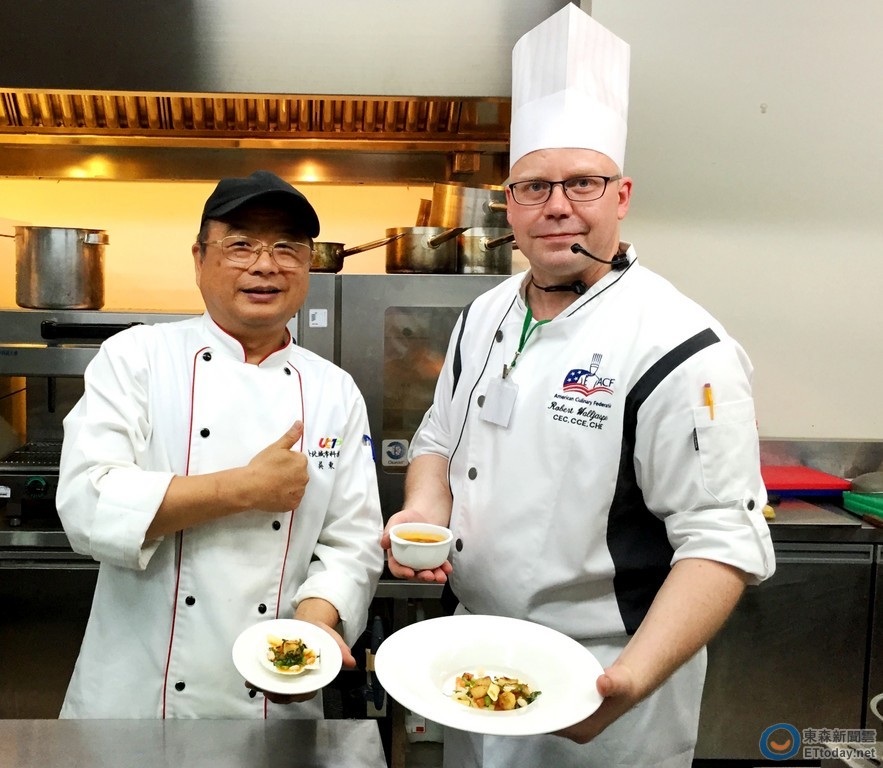 ▲曾任職福華行政主廚的餐管系業師吳東寶(左一)與22年專業廚師經驗的美國紐約廚藝學院教授Robert Walljasper(右一)聯合教學。