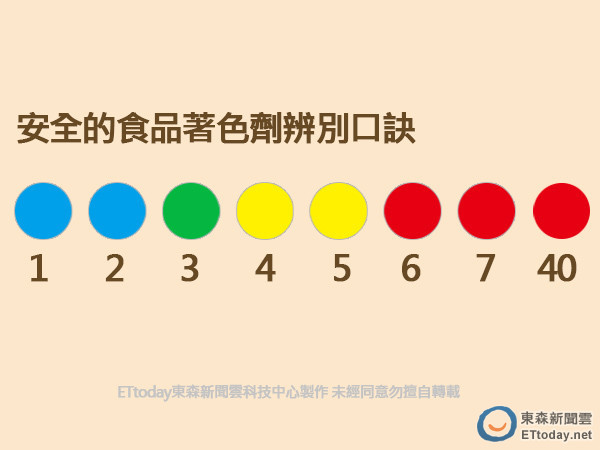 食品在加工時,會因溫度、光線、濕度等影響,使原本食材的顏色褪色,例如:經過殺進的果汁,就會造成非酵素性褐變,為了使食品的色澤一致,就會添加食用色素來調整顏色。我國對於食品著色劑的管理,都必須經過完整的科學安全評估後,才能使用在食品中,目前被核准的共有35種著色劑,那麼到底該如何知道那些色素才是正確的呢?專家有個色素辨別口訣那就是「藍藍綠黃黃紅紅紅,1234567+40」,依序對照下就是:藍色1號、藍色2號、綠色3號...以此類推。