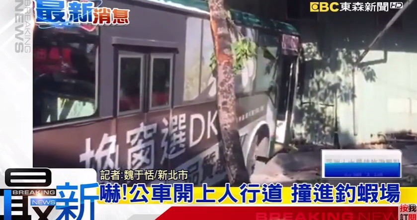 新北市蘆洲早上發生一起車禍,一輛三重客運行經中正路時,突然暴衝對向人行道,再撞進釣蝦場,疑似是因為駕駛從總站出發,經過轉彎時沒坐穩,從座椅上摔下,公車往左偏,才會衝進釣蝦場,巨大聲響嚇壞附近居民,幸好沒有人受傷,他也自行脫困,不過是否有疲勞駕駛問題,警方還要進一步釐清。