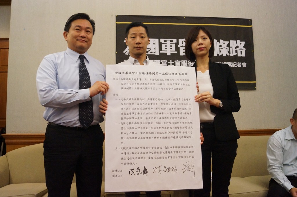 國軍日前頻傳「裝病退伍」,引發熱議,而時代力量立委洪慈庸、林昶佐及民進黨立委王定宇則在14日上午召開記者會,宣布提出《陸海空軍軍官士官服役條例部分條文修正草案》,明定常備軍官、士官自任官期三個月期滿,經人事評審會於三個月內確實審認離退意願者,得志願退伍;另外,相關之賠償費用與辦法授權由國防部依實際情形訂定。