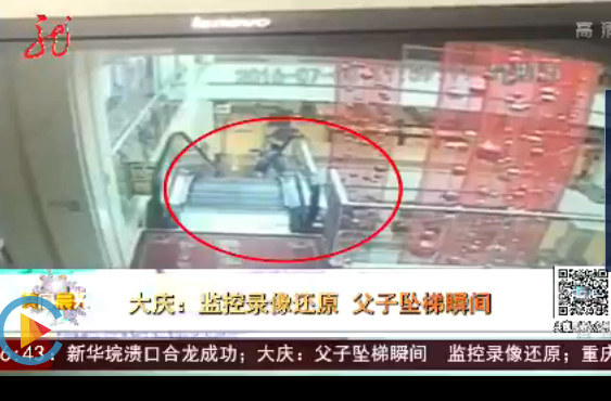 黑龍江大慶市購物廣場上周的恐怖電扶梯意外,造成37歲宋姓男子和2歲兒雙雙喪命。監視器畫面昨日曝光,父子倆在墜落前一刻並沒有任何動作,宋男也一直穩穩地站在電扶梯上,沒想到就這樣突然離奇墜下。