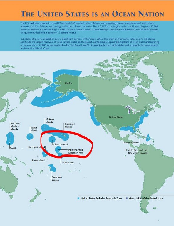 根據美國國家海洋和大氣局(NOAA)公布的美國專屬經濟區範圍,當中擁有200海里專屬經濟區的地點,分別是強斯頓環礁、帕邁拉環礁和金曼礁,但上述這三個「礁」不是面積超小,就是沒有自然水源,完全不符合「島嶼」的要件,但美國卻「稱礁為島」,官方認政這三個「礁」擁有「島」的200海里專屬經濟區。