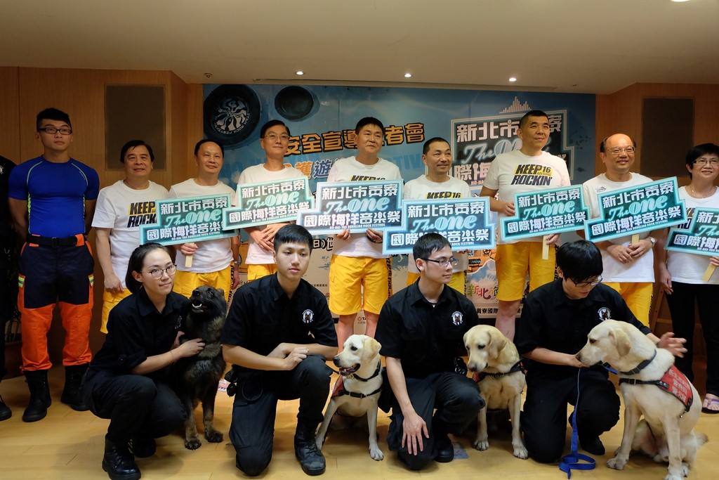新北市14日下午舉辦「貢寮國際海洋音樂祭安全宣導記者會」,出席的侯友宜表示,為確保最完善的防護措施,每日投入約1500名工作人員,記者會現場也邀請到消防猛男教導大家如何預防溺水,以及不慎溺水時如何自救,還有緝毒犬現場示範查緝違禁品,就是要讓大家玩得安全又盡興。