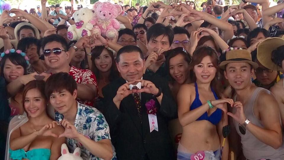 新北市聯合婚禮17日於貢寮福隆海水浴場盛大登場,市長朱立倫、副市長侯友宜親自為66對新人主婚、證婚。兩人也分別在臉書上分享和66對新人的大合照,朱立倫看到每對新人穿著清涼則自嘲:「我還是乖乖穿西裝當證婚人吧」;擔任主婚人的侯友宜則藉此向女兒喊話:「讓我這個老爸有機會當自家主婚人」。