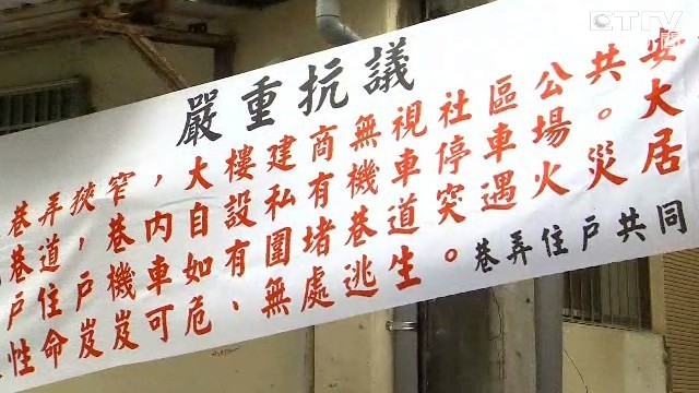 新建案大樓卻讓附近居民發布條抗議,原因是居民認為,原本有一條可以互通、接到外面道路的巷子,卻因為蓋了大樓,把巷口都堵死,騎車騎到一半就沒路了,林小姐說,「整個被堵死的,完全沒有第二條路,這也是唯一的逃生巷子,既然政府認為,這條是私人既有巷道,那前面也應該要有一條巷道,讓我們住戶可以走。」