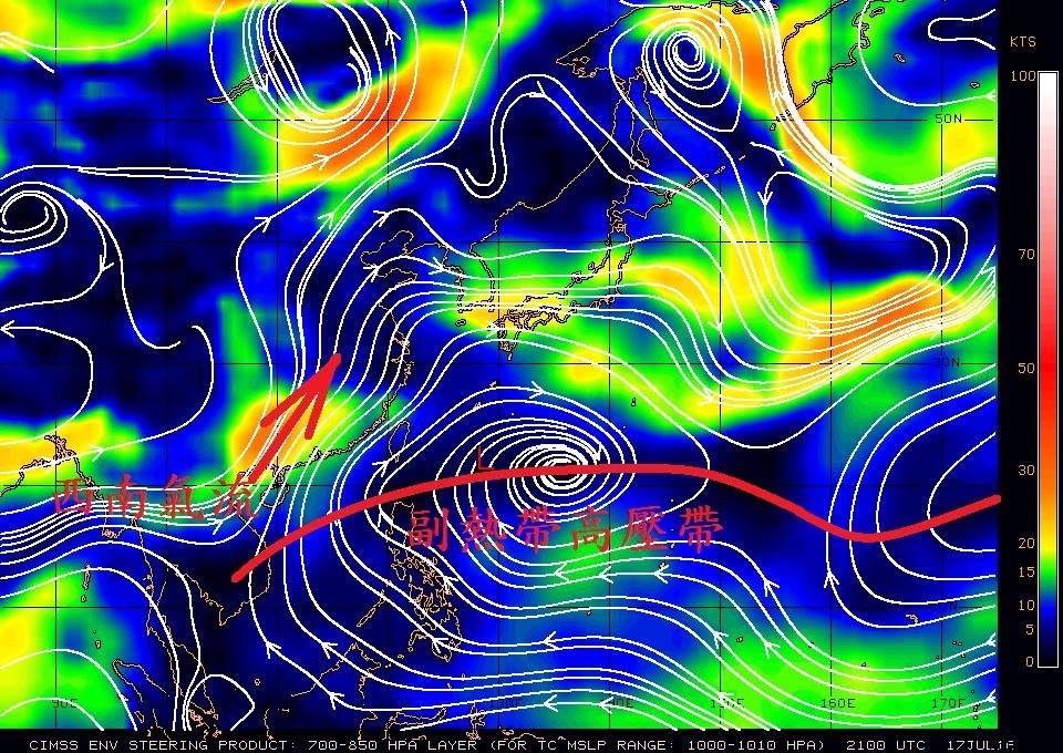 鄭明典用粗紅線標出太平洋高壓的「脊線」,並指出在這個時間點,它應該移到25緯度以北,但今年卻偏南又偏西,把印度洋來的西南氣流,阻擋在台灣遠遠的西邊,從孟加拉灣就北上進入中國大陸華南到長江流域,「這股水氣正使大陸洪災的災情不斷攀升,有可能成為中國大陸史上最嚴重的氣象災害事件。」