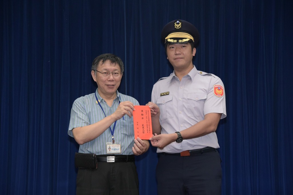 ▲柯文哲頒獎給北市員警宋俊良,表揚偵破一銀盜領案有功。(圖/市府提供,下同)