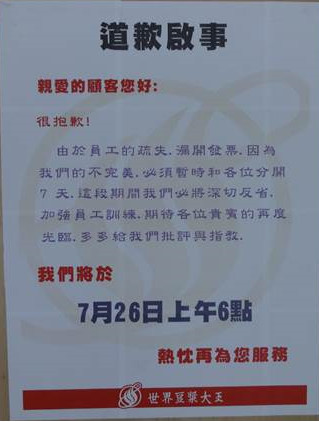 24小時營業的世界豆漿總店因員工漏開發票問題,遭到停業拉下鐵門,木板上貼出道歉啟事:「很抱歉!由於員工的疏失,漏開發票,因為我們的不完美,必須暫時跟各位分開7天...將於7月26日上午6時再為您服務。」