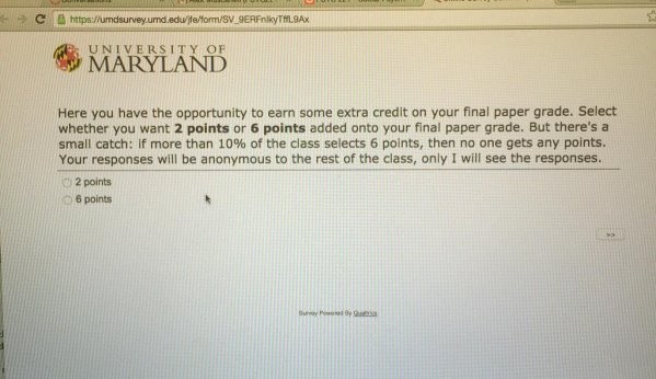 根據《華盛頓郵報》(Washington Post)報導,這道「加分題」是美國馬里蘭大學的教授狄倫(Dylan Selterman),他在社會心理學科目出給學生的考題。這道題目寫著,「你現在有機會得到額外的分數,可以在你的期末報告額外加多少分,2分或是6分?但這有個前提,若是班上有超過10%的人選擇加6分,那全班則沒人可以獲得額外分數。」