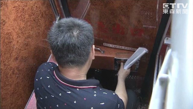 ▲同款遊覽車安全門「有暗鎖」,業者一度打不開。(圖/東森新聞)