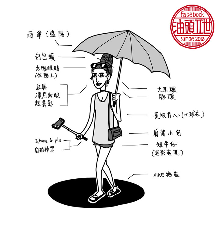 網路超人氣插畫家「油頭II世」圖解15項「稱職觀光客」基本配備,他向《ETtoday東森新聞雲》記者表示:「創作靈感是之前常看到這樣穿搭,加上最近去台南玩又看到,所以就把她畫下來。」從妝容、穿搭到配件的超精闢分析讓網友笑說:「我超稱職!」