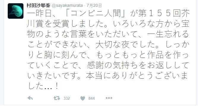 ▼村田沙耶香推特全文。(圖/翻攝自村田沙耶香Twitter)