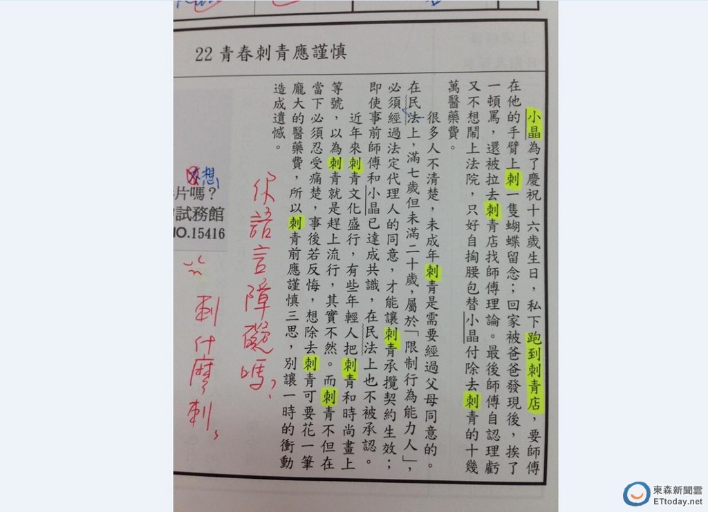 國中時期總有許多青澀又瘋狂的回憶,值得讓人一再回味。有一名網友在PTT《JOKE》版上發文,當時國中聯絡簿下面會有老師分享的文章,由於國三生活壓力大,於是開始亂畫重點。原PO重點畫得太有戲,重新排列組出許多令人笑翻的新句子,如「陰九最性感」、「因9的胸部下垂」,令網友笑翻。