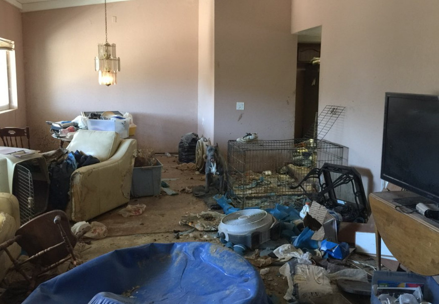 根據《洛杉磯時報》報導,加州河邊有棟民宅相當髒亂,不時傳出惡臭,鄰居受不了便打電話報警,警察破門而入才發現,屋內居然有多達20左右的犬隻,其中有11隻鬥牛犬更是身體蜷曲倒臥在地,已經不幸身亡。從相片中可以看到屋內相當髒亂,地板沾滿排洩物,窗戶都被關起來,密不透風,環境相當惡劣。