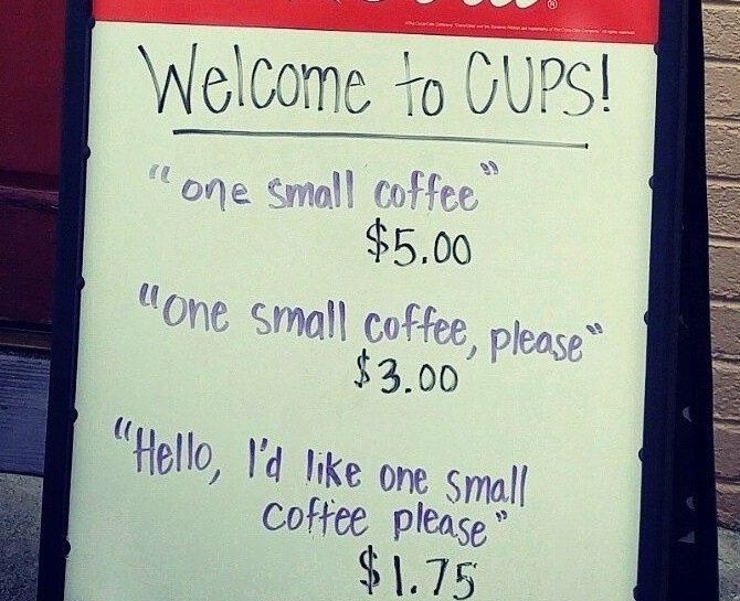 根據外媒《HDTV》報導,這間位於美國維吉尼亞州的咖啡店CUPS Coffee & Tea,店門口的小黑板寫著3種咖啡的消費計價方式,短短1周就吸引許多民眾的目光!從照片中可以看見,同樣一杯咖啡的售價可依照顧客展現的態度差異,有所增減。消費者若說:「小杯咖啡」5元美金,而「一份小杯咖啡 麻煩你 」3元美金,想要獲得更多折扣要說「你好!我需要一份小杯咖啡 謝謝」則可以1.75元美金購買,越沒禮貌價格就會越貴。
