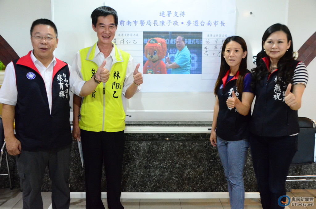 台南市議會國民黨籍議員蔡育輝、林燕祝、李中岑及無黨籍議員林阳乙等人,22日上午在台南市議會公開呼籲國民黨籍、無黨籍市議員等,能積極參與聯署聯合支持前南市警局長陳子敬參選下屆市長,改變台南市政治框架,終結藍綠政治間對抗,讓台南市邁向政治清明新旅程。