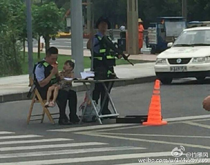 ▲網友拍下3歲女童送西瓜給值勤爸爸的感人畫面。(圖/翻攝自竹墨風微博)