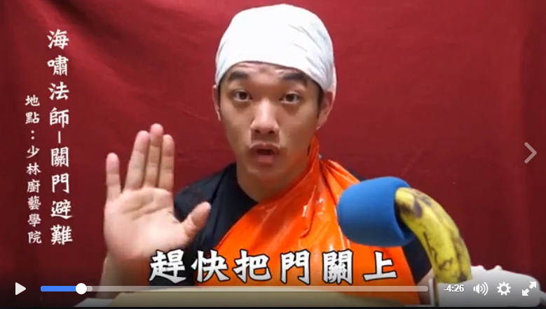 海濤法師因「老公外遇,假的!是你眼睛業障太重」等言論爆紅,成為大家爭相模仿的新對象。消防員許書旭日前就拍攝一段影片,打扮成「海嘯法師」教導大家火災逃生新觀念,「你打開房門一看,哎呀!外面濃煙密布,你該怎麼辦?趕快把門關上!」逗得網友捧腹大笑。