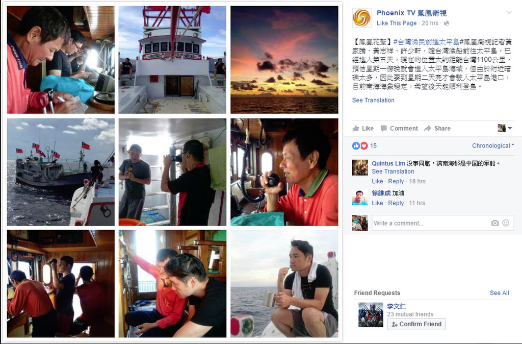 鳳凰衛視在臉書上先寫到,目前已經航行第5天,預計26日清晨登島;2小時候又發文表示,海巡桃園艦出現並要求與船長對話,提供其他安全的航線,也會在周邊護航,「是否藉此監視漁船,並阻撓漁民和鳳凰記者登島,還有待觀察。」