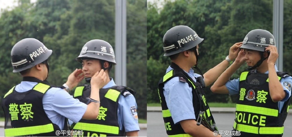 成都警方經常在微博更新動態,拉近與民眾的距離,近日就發布一組照片是2名執勤員警互相調整帽子的角度,溫馨的同事情誼又不失「基情」惡趣味,讓許多網友嘴角失守,紛紛留言:「我的腐女魂又開始熊熊燃燒了」、「太有愛了」、「可愛死了」。