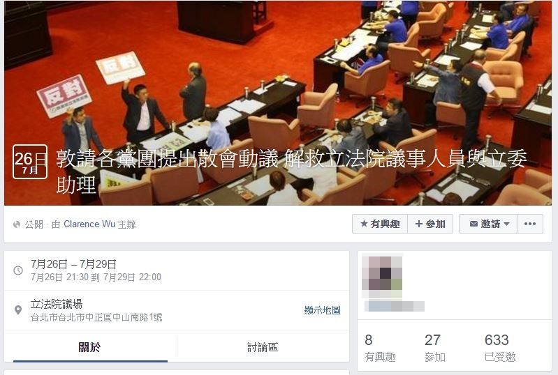 為了終止這場「惡鬥」,有網友在臉書上發起「敦請各黨團提出散會動議 解救立法院議事人員與立委助理」活動,呼籲大家共同來解救無辜的議事人員與立委助理,只要立法院4黨團提出散會動議,就能解決問題,「放無辜的大家回家睡覺,讓大人們去協商會場傷腦筋解決雙方歧見,終止這齣無聊透頂的惡鬥表決爛戲」。