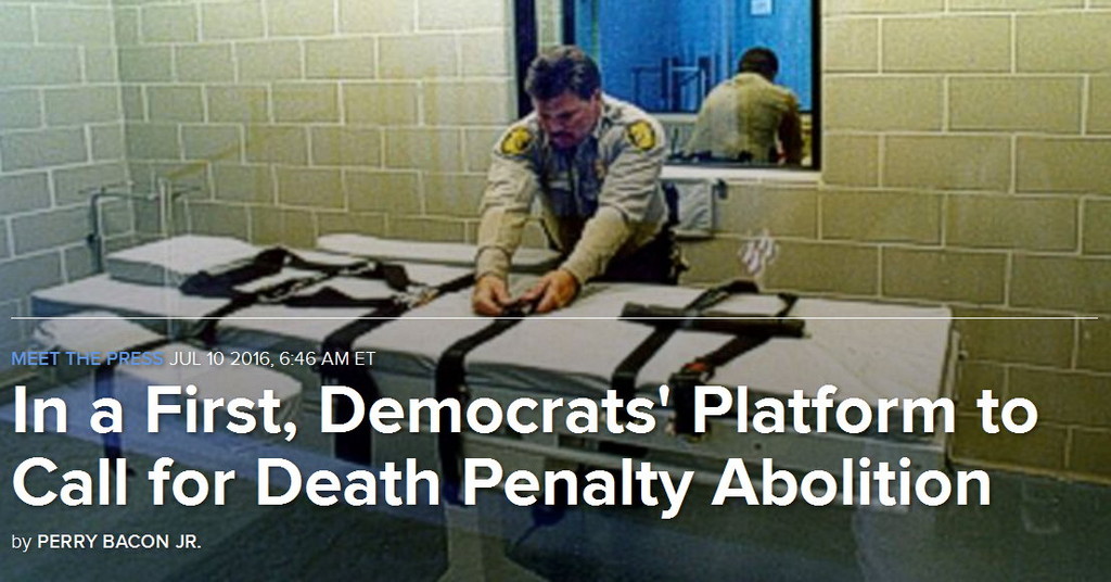 民主黨總統候選人希拉蕊初選時的競爭對手、佛蒙特州參議員桑德斯長期反對死刑。黨綱納入上述表態,被認為是桑德斯的勝利,也是希拉蕊為團結全黨所作的選擇。