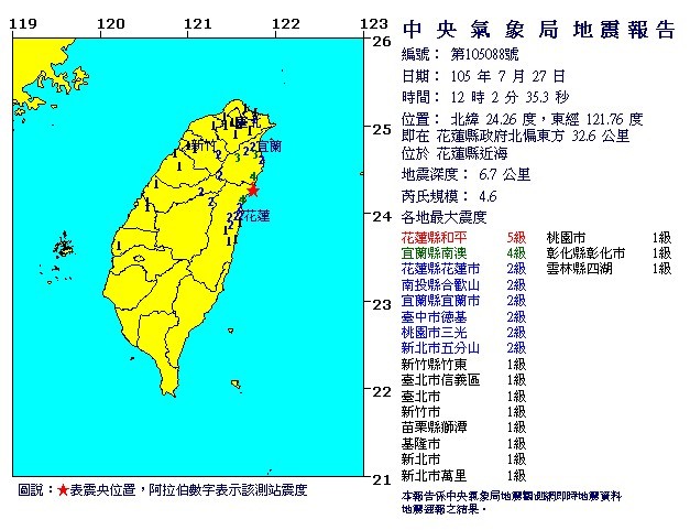 27日上午12時2分發生有感地震,根據中央氣象局的地震報告資料,規模4.6,震央位於花蓮縣政府北偏東方32.6公里,即位於花蓮縣近海,深度6.7公里,花蓮縣和平最大震度5級。