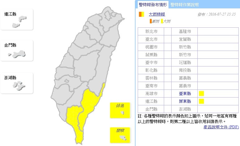 由於午後對流發展旺盛,部分地區易有短時強降雨,中央氣象局稍早針對台東縣、屏東縣2縣市發布大雨特報,指出今天(27日)屏東地區及台東地區有局部大雨發生的機率,請注意雷擊、強陣風,山區請慎防坍方、落石及溪水暴漲。