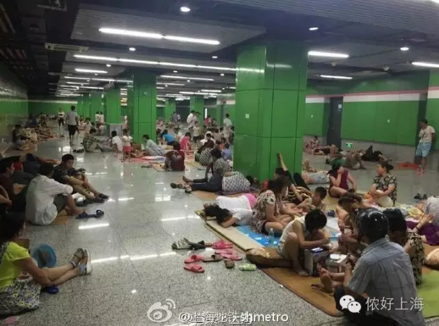 據陸媒報導,這幾天連日高溫,使得上海地鐵站被大批民眾「佔領」,許多婆婆媽媽們帶著孩子,自備草蓆、紙板,直接在地鐵站內席地而坐,利用公共場所內的免費冷氣乘涼。