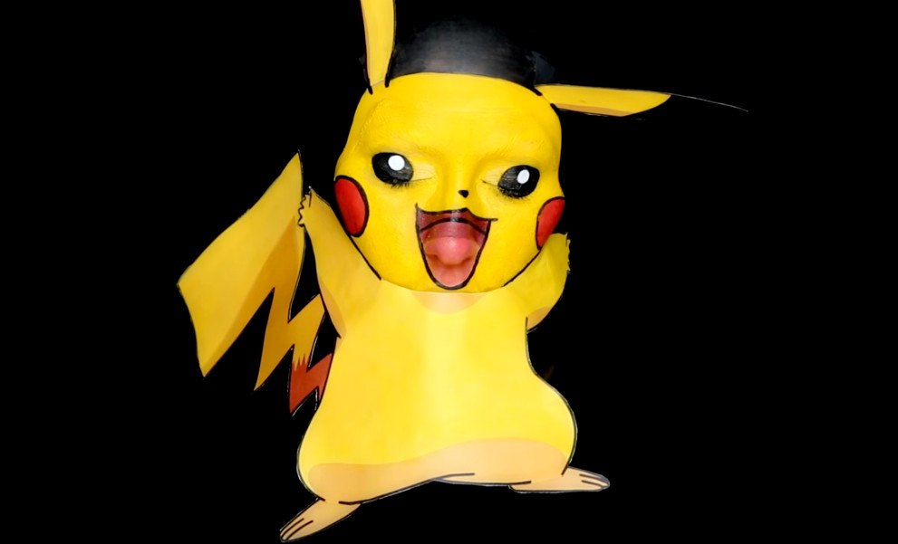 影片中,Chrisspy先用顏料將眉毛蓋住,再戴上頭套,開始將臉部塗上大片的黃色顏料,讓膚色變得跟皮卡丘一樣,接著勾勒臉部的線條,畫出精靈的腮紅、鼻子和嘴巴,最後黏上耳朵和身體部位的道具,驚人的作品就宣告完成了。