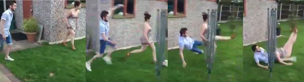 26歲的丹尼爾(Daniel Hammond)和22歲的艾莉諾(Eleanor Martin)是一對情侶,23號他們在自家的後院踢足球,不過因為丹尼爾的惡作劇,讓穿著裙子的艾莉諾踢球時四腳朝天的摔在他的身上,只能說丹尼爾的惡作劇雖然成功,但是也害到自己啦!