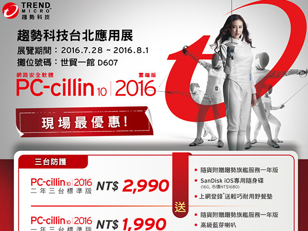 因此,趨勢科技特別於7月28日至8月1日台北電腦應用展推出購買PC-cillin 2016雲端版隨貨附贈趨勢科技旗艦服務一年版或買一送一優惠,再送SanDisk隨身碟或高級藍芽喇叭等精美好禮,且上網登錄加碼再送輕巧耐用野餐墊,讓消費者以最優惠的價格,一次備妥最全面的資安防護。(趨勢科技攤位號碼:世貿一館D607。)