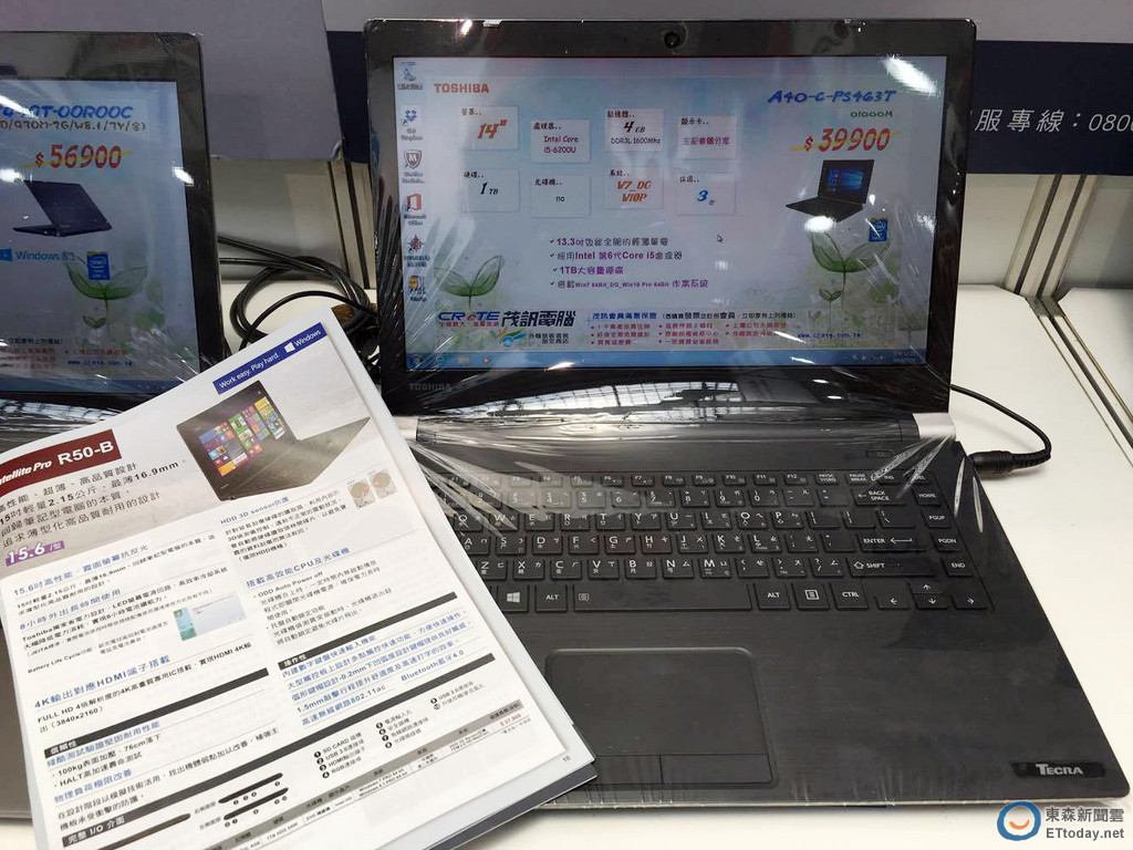 在售價方面,以 Toshiba R50-B(PSSG2T-02C01T) 來看,該款筆電配備 15.6 HD(1366X768) 螢幕,搭載 intel Core i5-5200U 處理器,記憶體也採用舊的 DDR3L 4GB,硬碟採用 1TB HDD 5400 轉,還有 DVD 燒錄機,搭載 Windows 7 PRO 64bit 作業系統,建議售價為新台幣 37,900 元,展場價格為新台幣 32,900 元,而且僅搭贈電腦包等簡單贈品,相對於第六代處理器筆電來說,其實沒有比較划算。