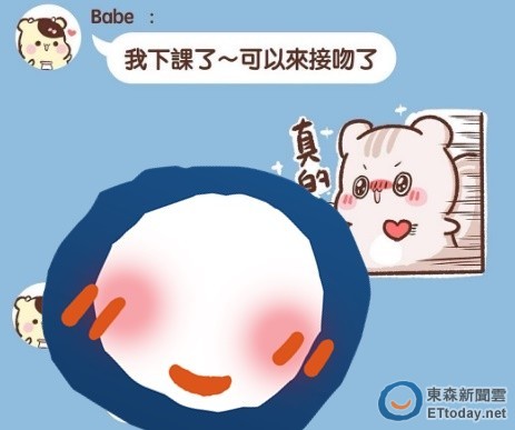 只見對話截圖中,女友說「我下課了~可以來接吻了」,對方立刻回覆「臉紅心跳」的貼圖,看起來像是眼睛射出兩道光芒,點頭如搗蒜的說「好好好」,不過隨後女友就發現自己打錯字啦,其實是要說「接我」。