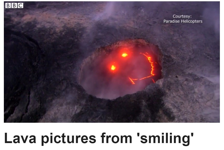 夏威夷基拉韋厄火山(Kīlauea)日前噴發,由於周遭已被滾燙流動的岩漿覆蓋,目前該區國家公園關閉遊客進場。不過特別的是,直升機經由火山口上空攝影,竟然拍攝到「笑臉」,讓網友感到驚奇。基拉韋厄火山是夏威夷醉活耀的火山之一,據統計,在20世紀內共噴發45次,當地民眾認為該火山是火山女神的駐地。