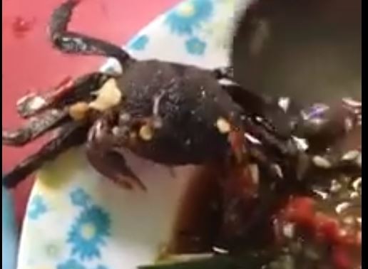 泰國「泰叻報」(ไทยรัฐ)報導,根據這名網拍攝的影片,當時他正在享用一條烤魚和涼拌沙拉;不料,盤裡的一隻螃蟹竟突然動了起來,並試圖爬出盤外;當事人不敢大意,便用湯匙撥弄了幾下,證實牠果然是活的,於是也不忍心繼續吃,只好將其放在烤魚盤子內,之後再帶去河邊放生。