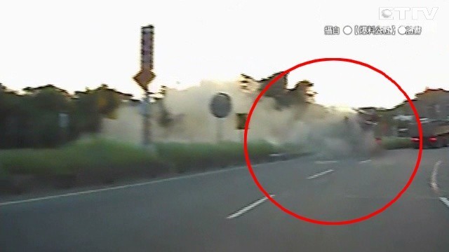 「啊(女乘客尖叫聲)……XXX……(女乘客:怎麼會這樣,嚇死我了,嗯啊……)」,只見大貨車擦撞安全島後翻向對向車道,激起大片煙塵,肇事車輛瞬間「消失」,目睹驚悚過程的自小客女乘客嚇得不斷尖叫,似乎快哭出來,男駕駛更是連飆髒話掩蓋恐懼。