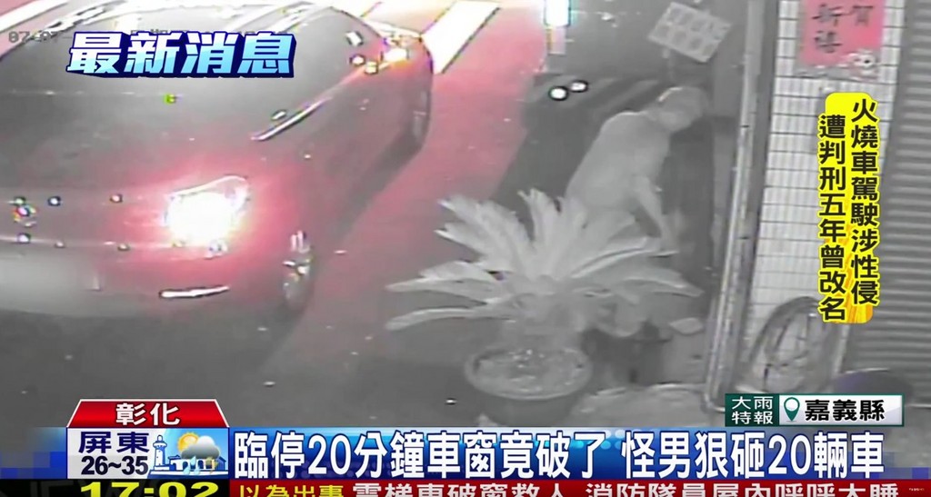 警方調閱監視器畫面,可見一輛休旅車臨停在民宅前,一名男子走出來,稍微查看了一下後,居然撿起水泥塊朝後擋風玻璃砸去,第一次沒有破,他又撿起來再丟一次,直到玻璃破碎為止,拍拍屁股離去。