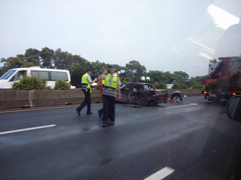 警方調查,事發於30日下午近5時,大林地區當時下著大雷雨,一輛紅色轎車原本行駛在中線道,不明原因偏向外側,撞擊護欄後又彈回車道上,而後方高速行駛的砂石車和另一輛轎車也因閃避不及撞上,紅車當場轉了90度撞上分隔島,車身扭曲變形,車頂整個凹陷,幾乎成為廢鐵,可見當時衝撞力道之大。