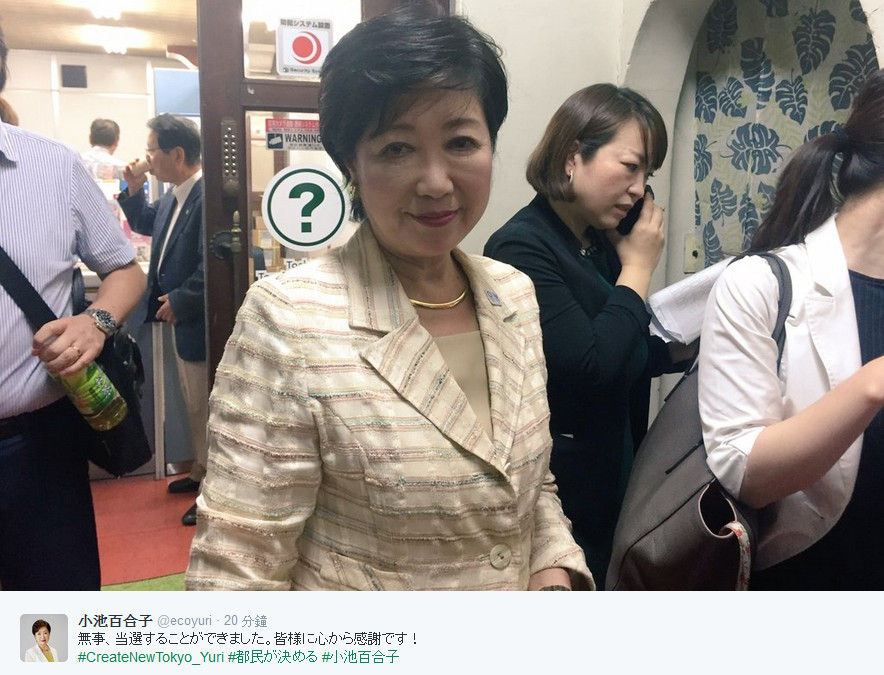 小池百合子隸屬自民黨籍,擔任過主播、國會議員、環境大臣、防衛大臣等職務,雖然此次參選不受到自民黨支持,但他仍堅持獨立參選,最終擊敗其他候選人,高票當選東京都知事。結果出爐後,她隨即在個人推特上表示,「安全上壘,此次能夠贏得選戰,我誠心地感謝各位選民」。